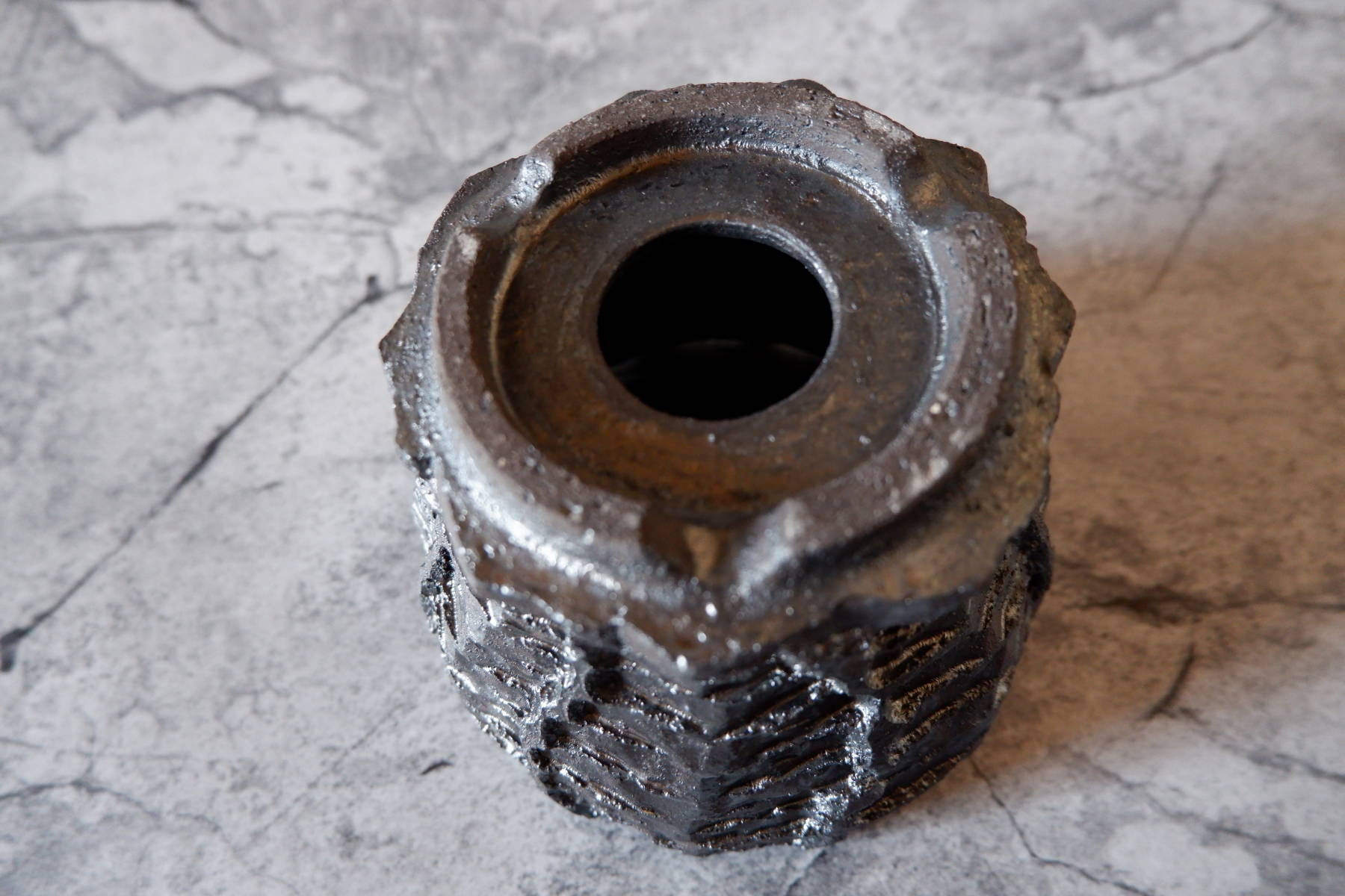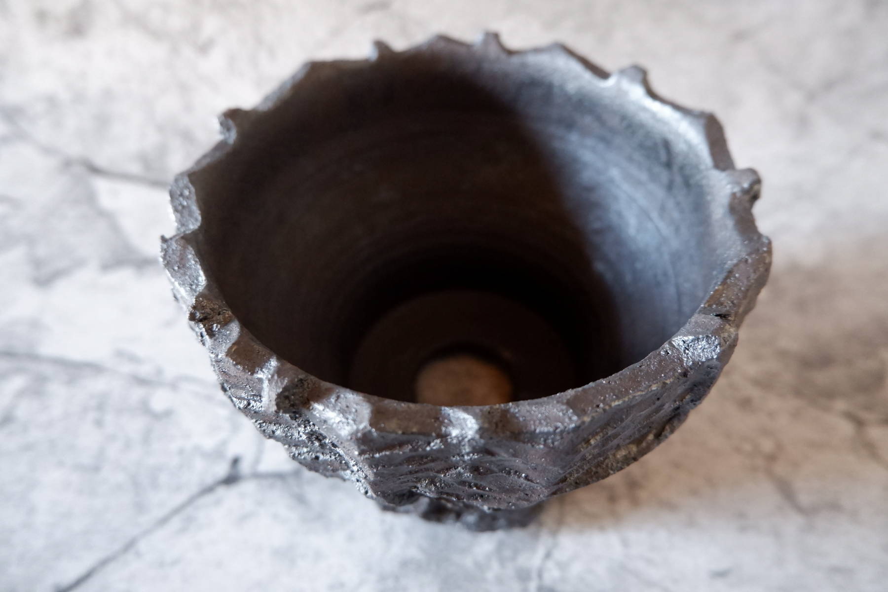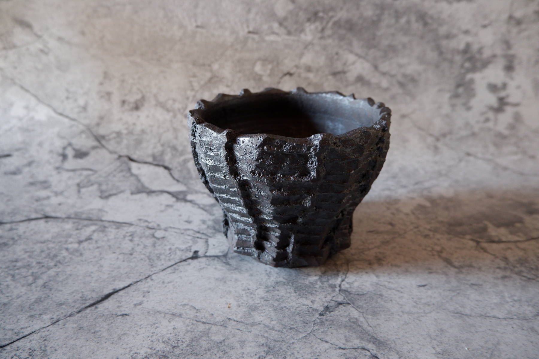 艶を抑えた黒釉は所々に結晶のような凹凸のあるランダムな模様が現われ、粗い土肌と相まって表情豊かです。