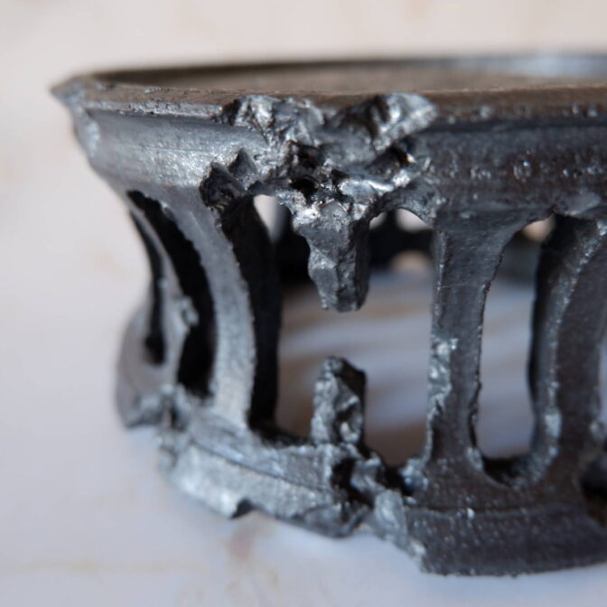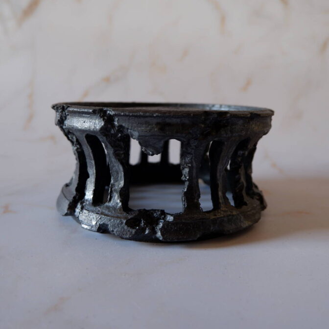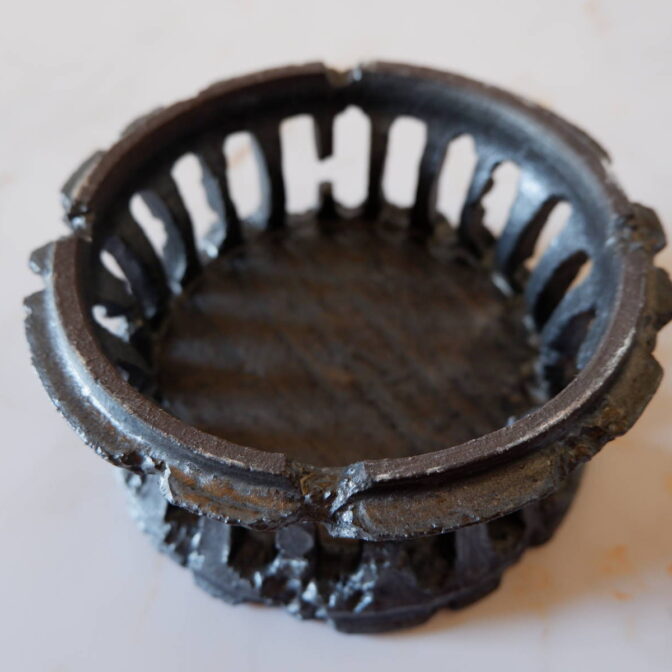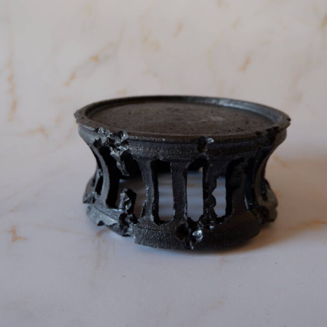 本作は、植木鉢を乗せて植物を飾る透かし彫りの鉢台です。