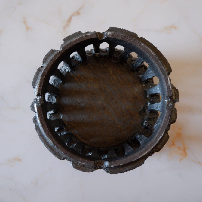 側面に亀裂のような深く荒い彫りを施し、縁にはクラックを加えました。