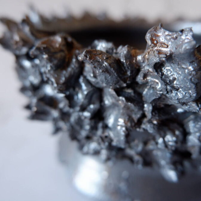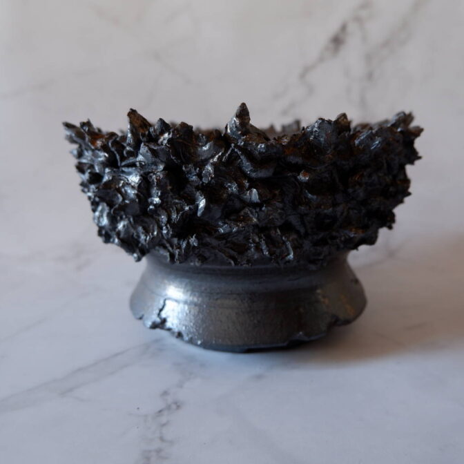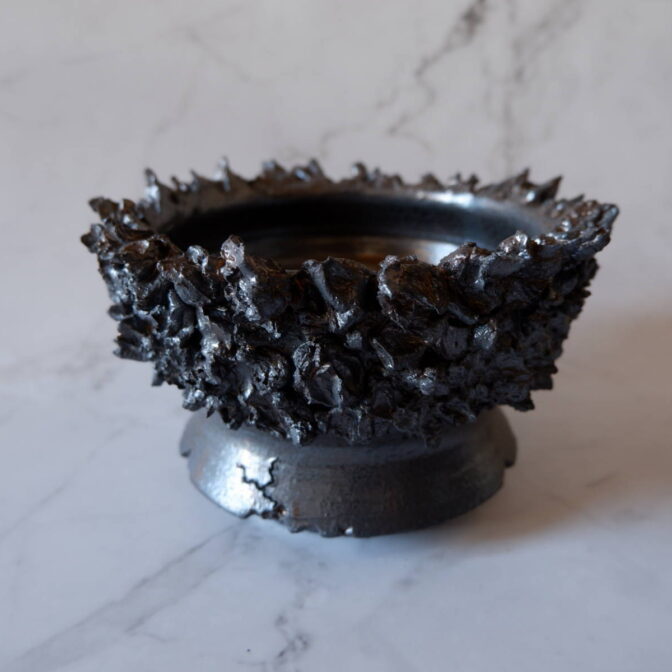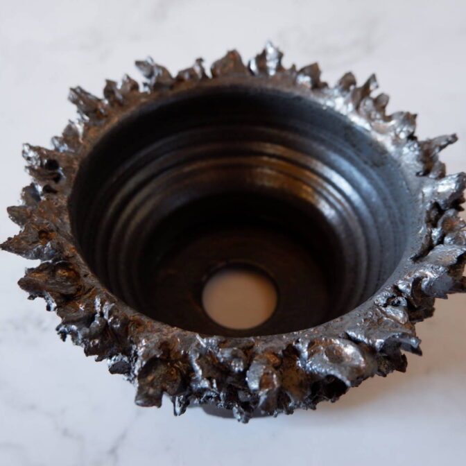 本作は、鉢の上半分に土を荒々しく塗り付け、下の縁にクラックを加えました。