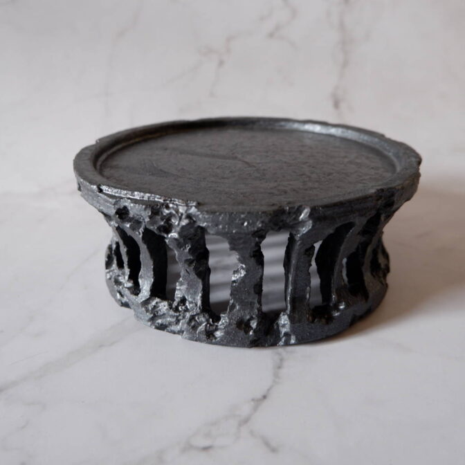 本作は、植木鉢を乗せて植物を飾る透かし彫りの鉢台です。