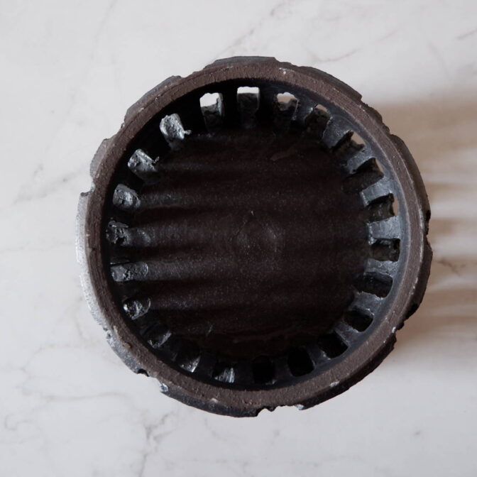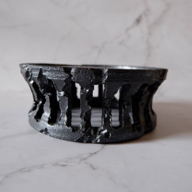 側面に亀裂模様が入った格子状の透かし彫りを施し、縁にはクラックを加えました。