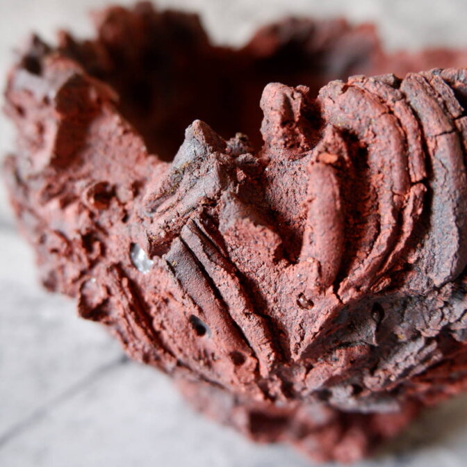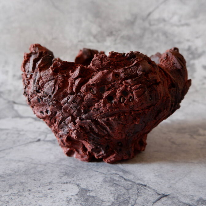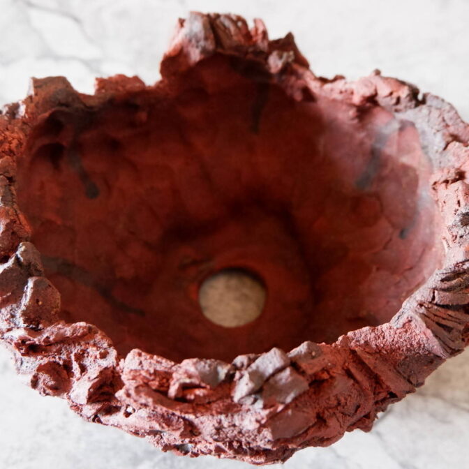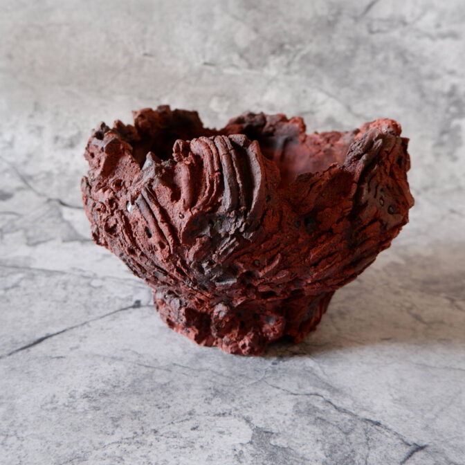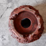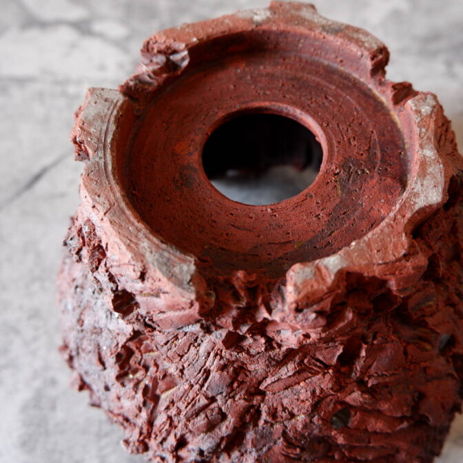 赤い土肌の所々に中粒、小粒の焼けた富士砂や軽石が顔を出し、ヒダと裂紋の組み合わせが荒々しい全体の表情を荒々しくしています。