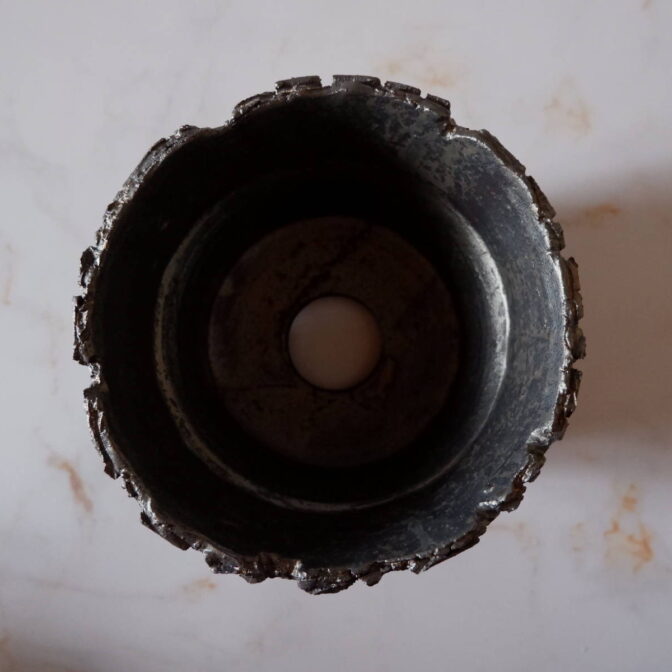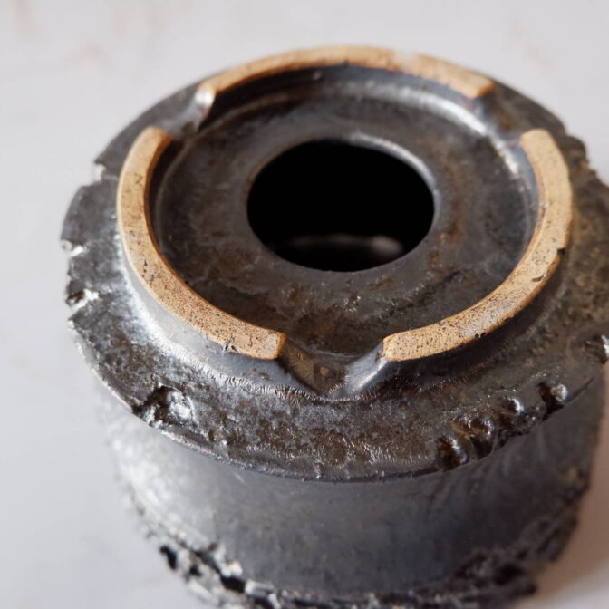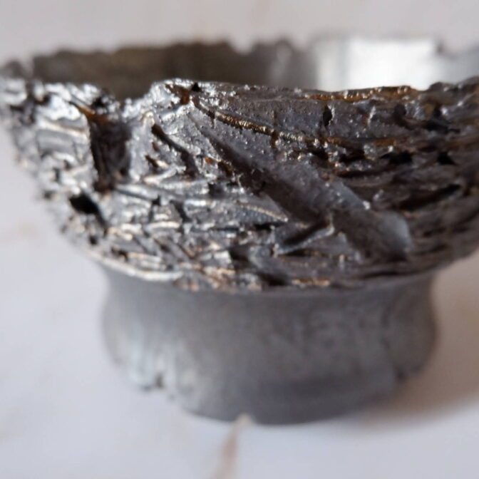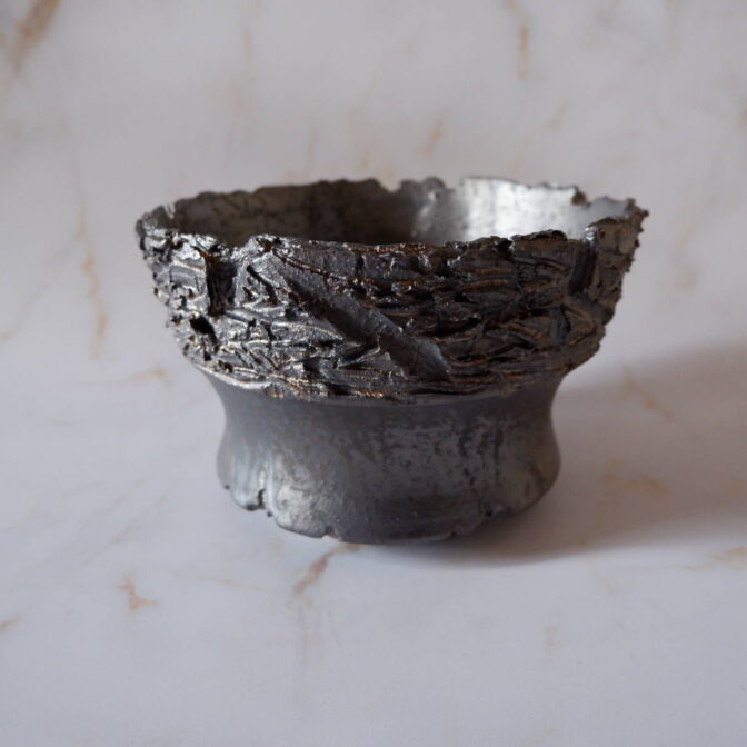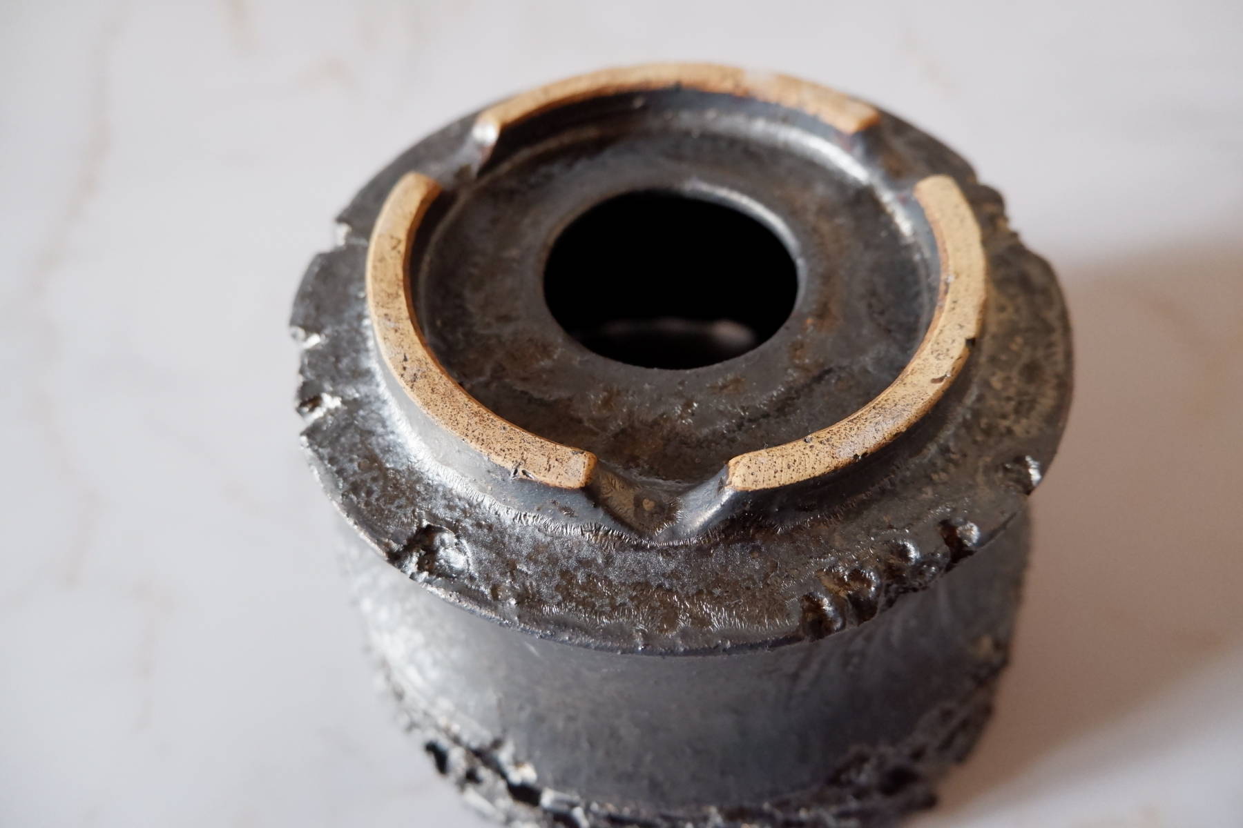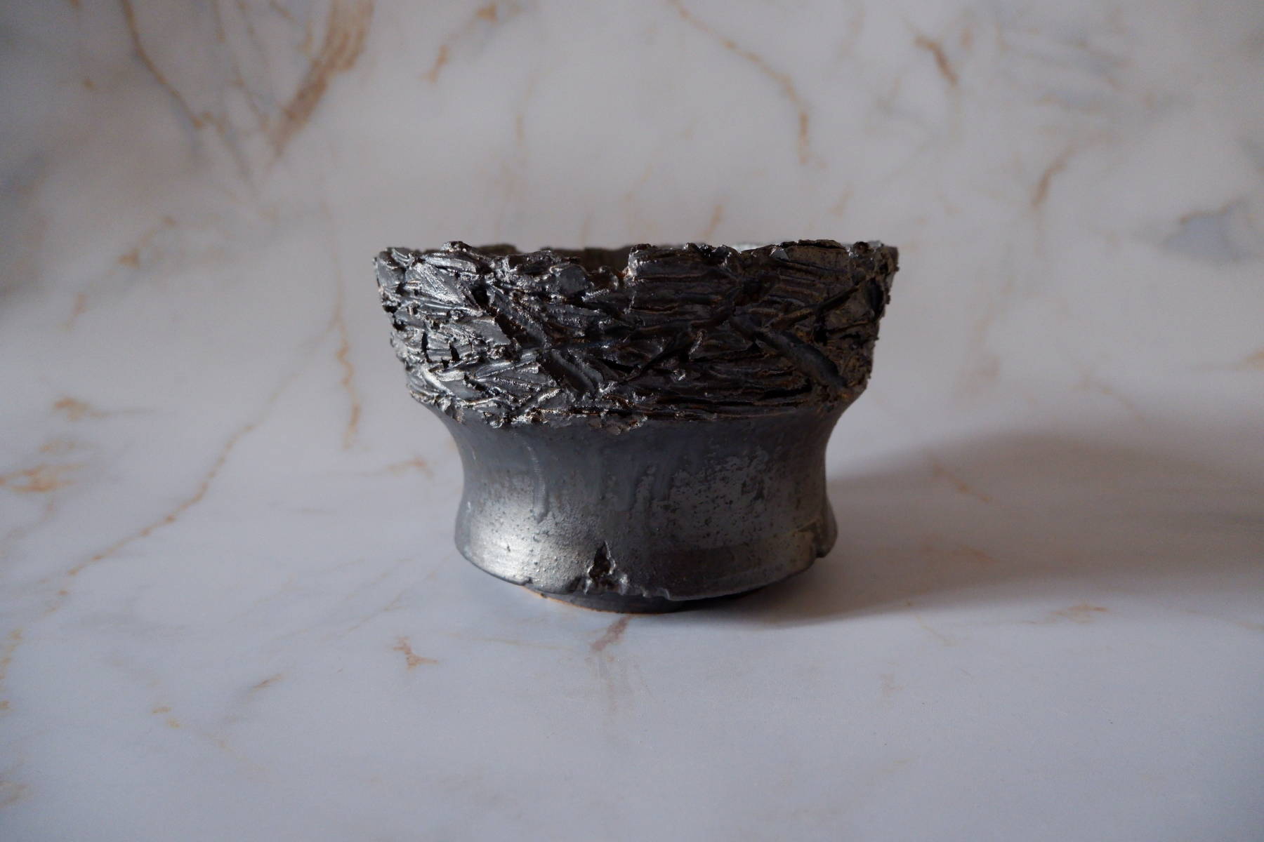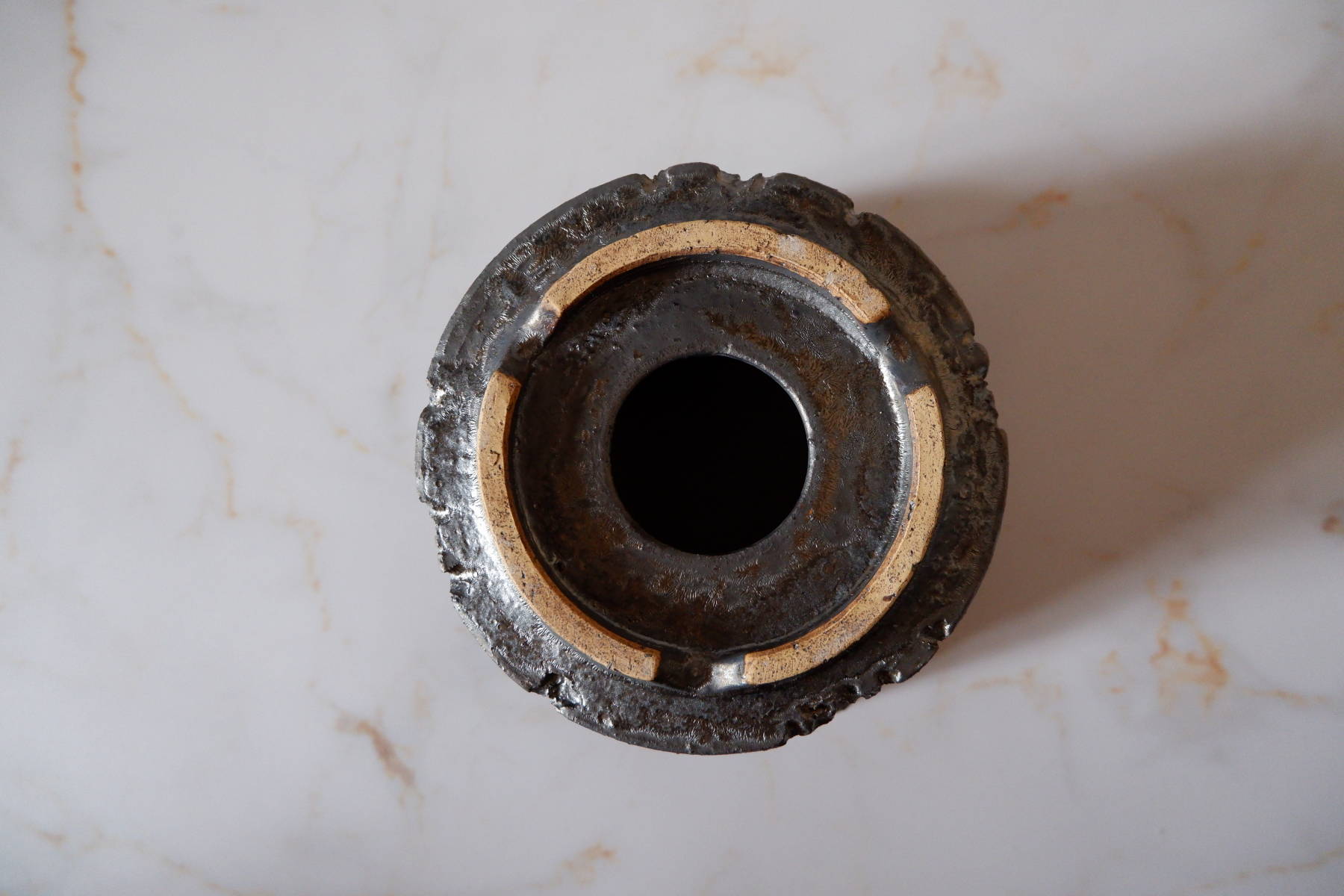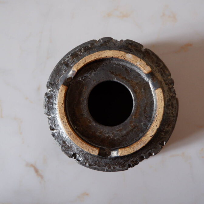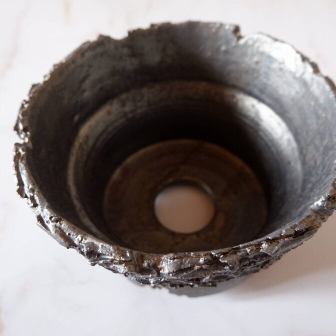 縁の溝など釉薬が溜まった個所は明るいブロンズ色に発色していますが、全体的にはメタリックな光沢を帯びた黒茶色です。