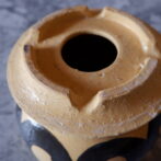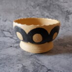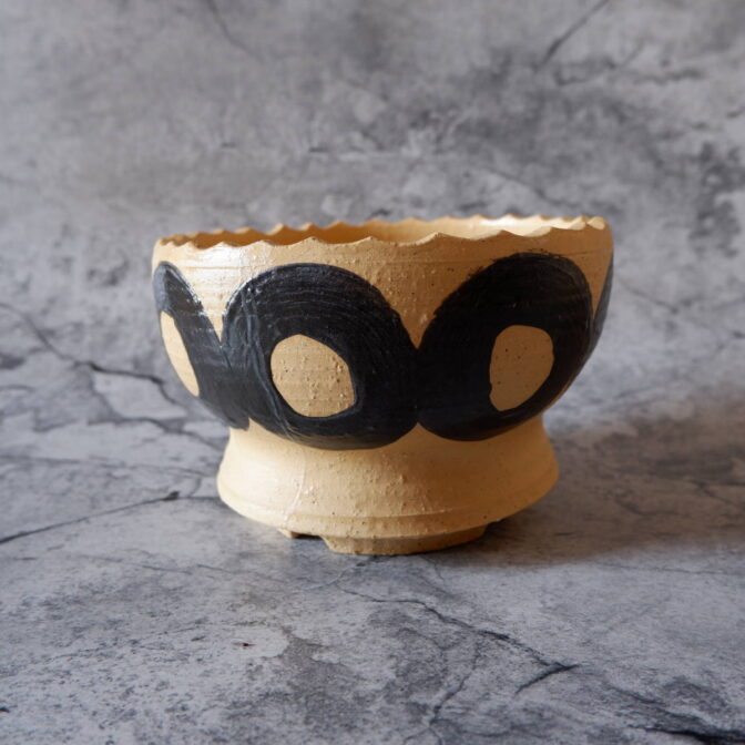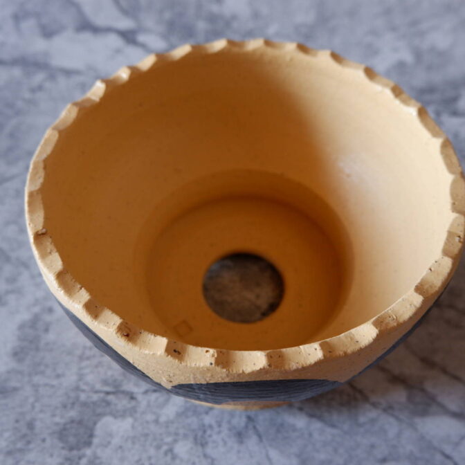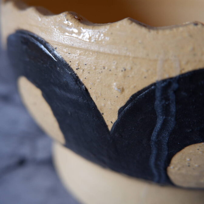 本作は、小石などを練り込んだ目の粗い黄色い土の側面に黒化粧土で模様を描きました。