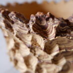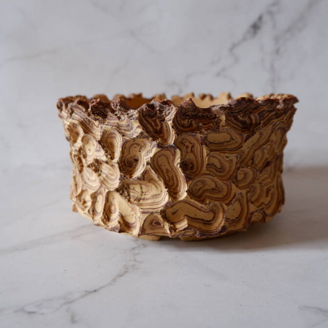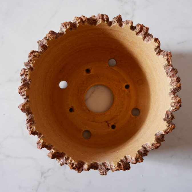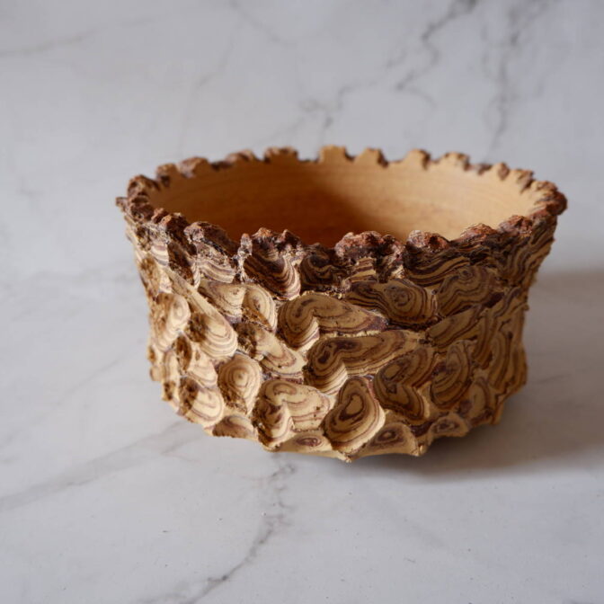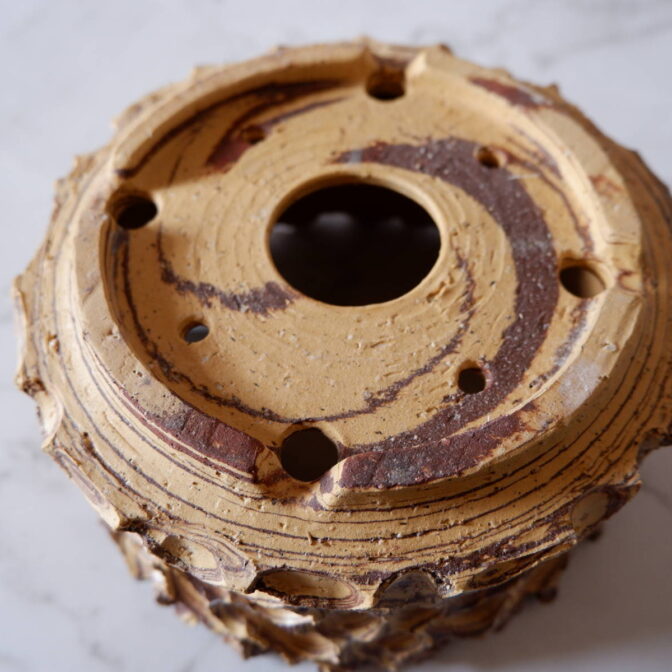本作は、黄土と赤土を層状に練り込み荒く深い彫り模様を加え、縁をギザギザの形状に彫り出しました。