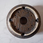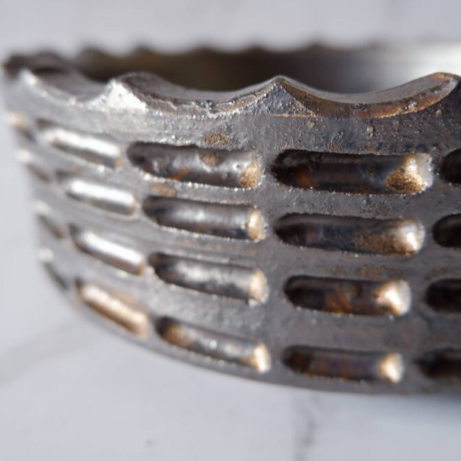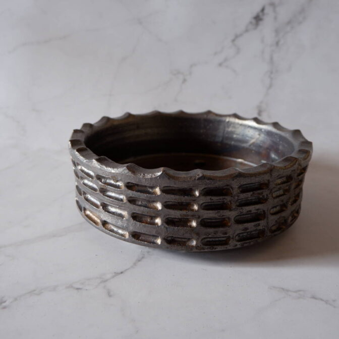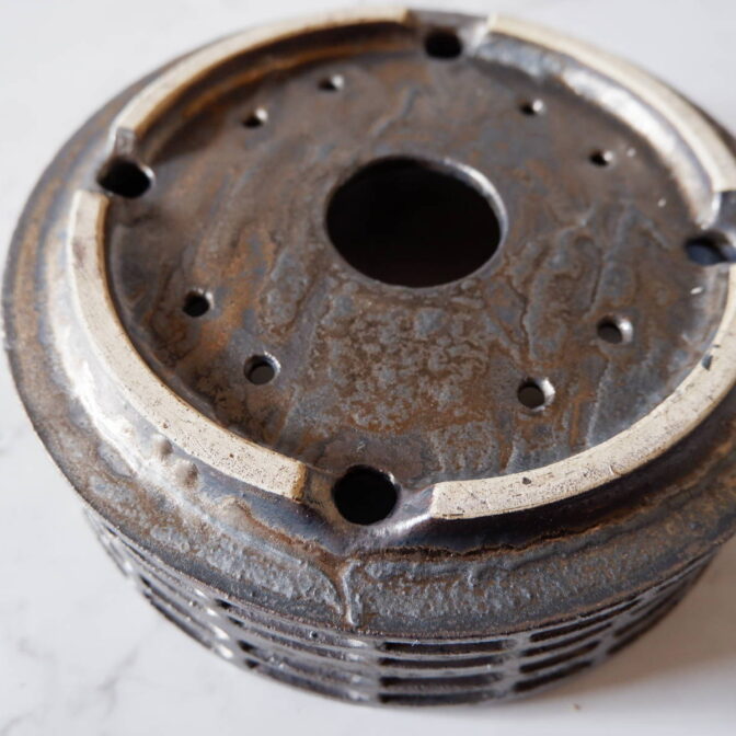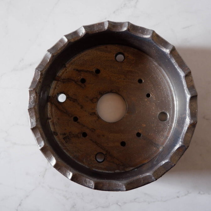 縁や溝など釉薬が溜まって濃く掛かった部分はブロンズ色が明るく発色していますが、全体的には光沢を抑えたメタリックな黒っぽいこげ茶、錆びた金属のような渋い発色です。