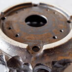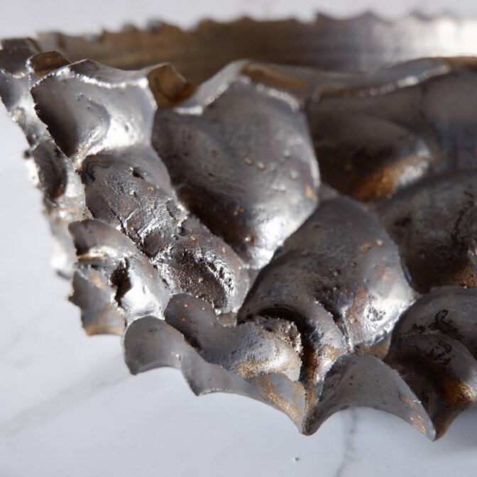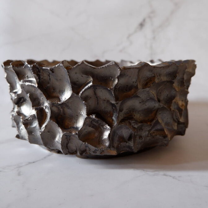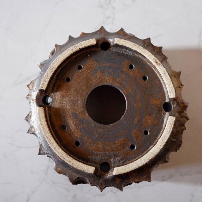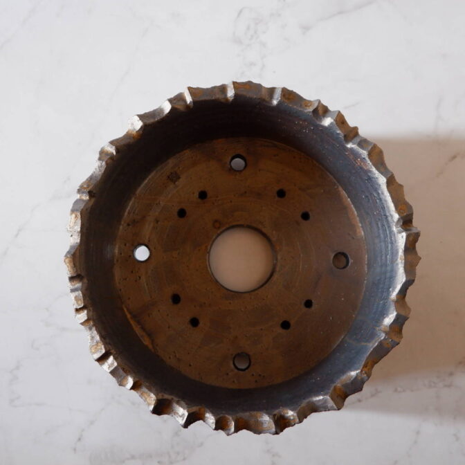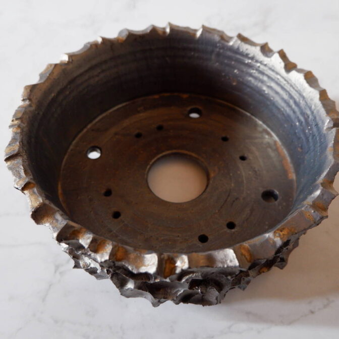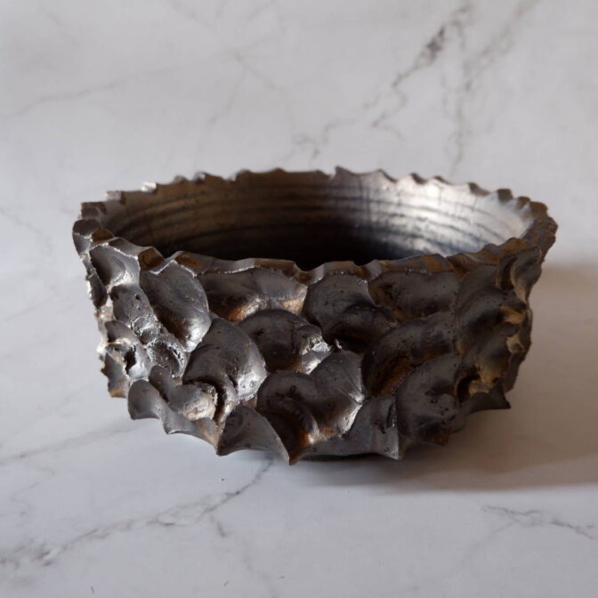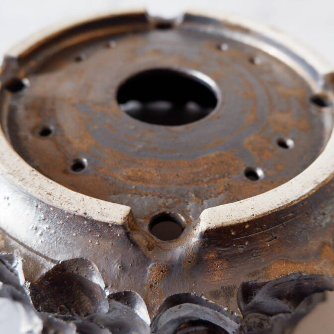 縁や溝など釉薬が溜まって濃く掛かった部分はブロンズ色が明るく発色していますが、全体的には光沢を抑えたメタリックな黒っぽいこげ茶、錆びた金属のような渋い発色です。