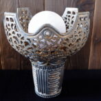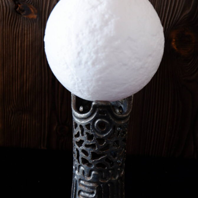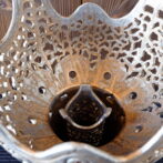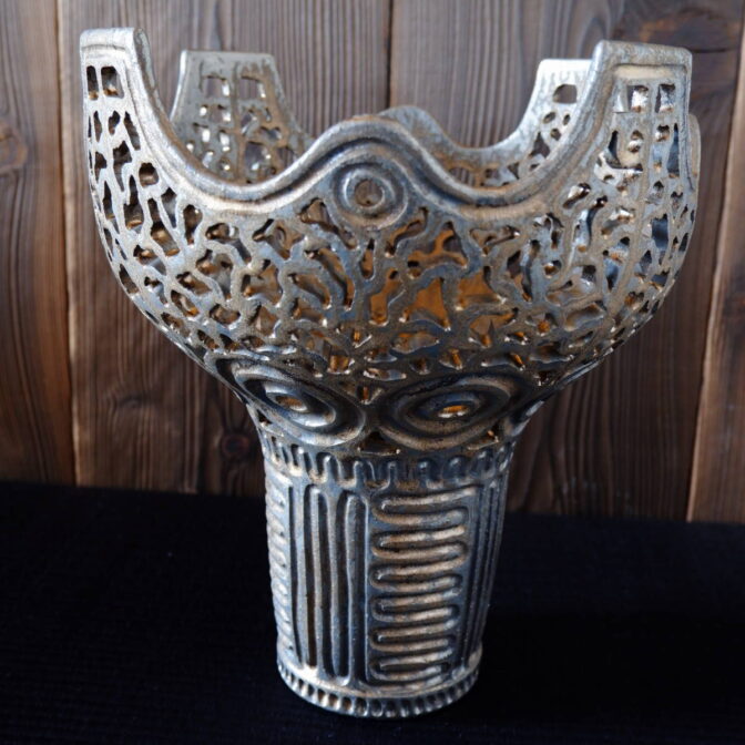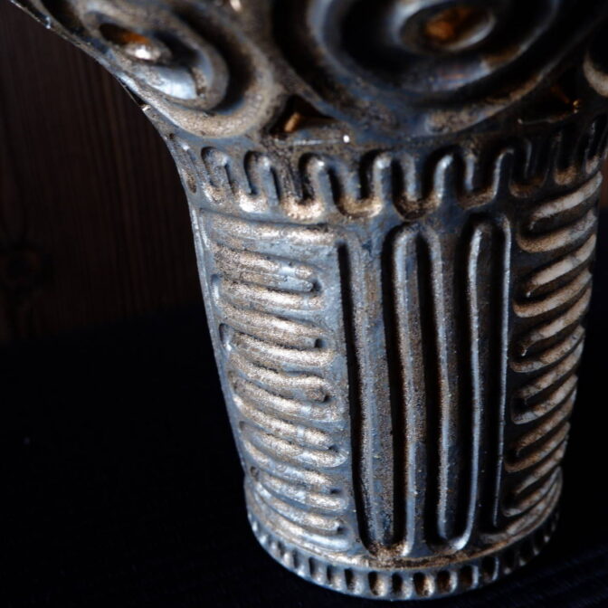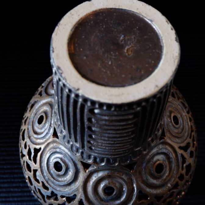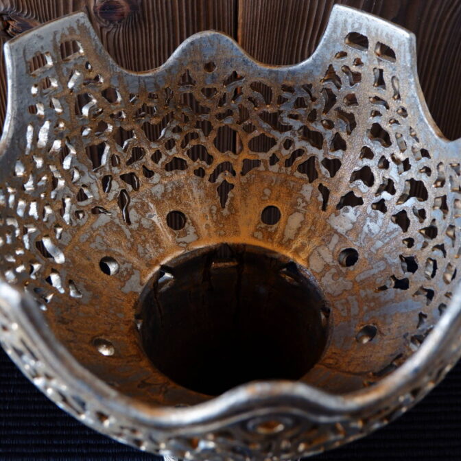 上部の開いた部分には全体的に透かし彫りを施し、中央帯部分には同心円模様を並べ、下部には一本線で一周繋がっている鎬模様を施しました。