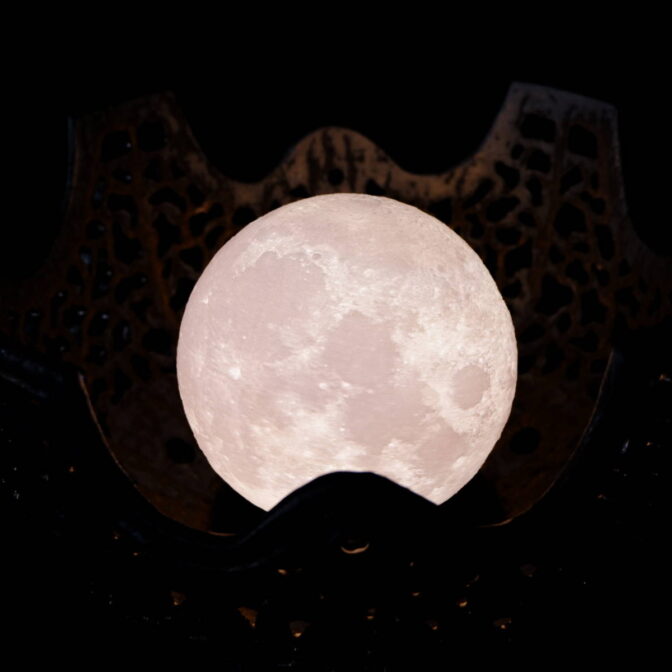 光源は3Dプリンターで月面を精巧に模した「匠の誠品」製のコードレスLED「月のライト」の径13cmサイズです。