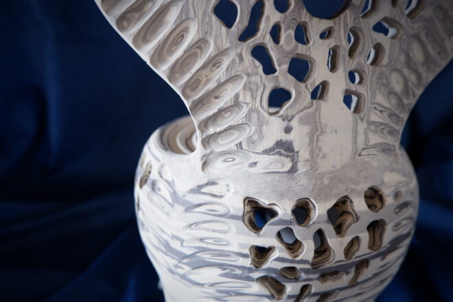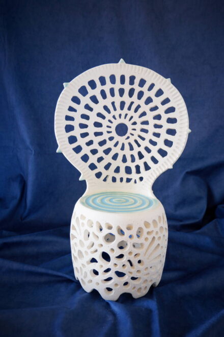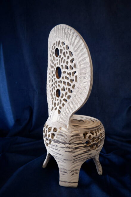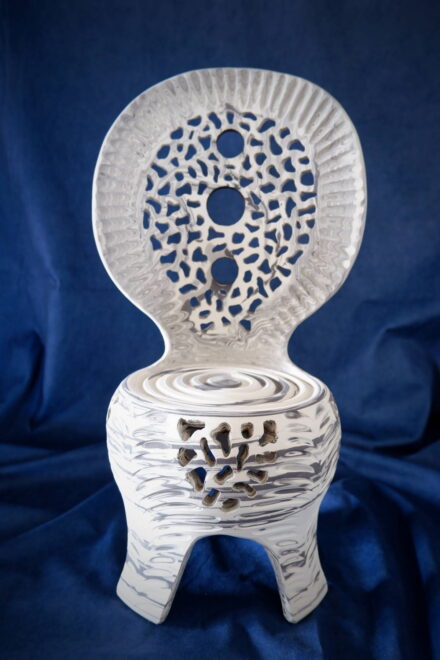 背もたれ部分はタタラ作りなのでマーブル模様に、台座はロクロで轢きましたので渦巻き模様になりました。
